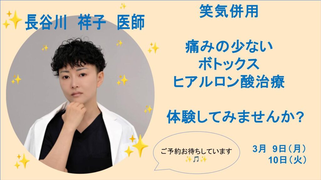 3月9日(月)・10日(火)に、美容外科歴10年以上の長谷川祥子Dr.がBell Clinicに来院されます。